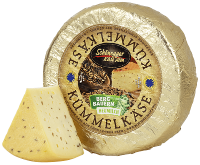 Der Kümmelkäse ist ein rotgeschmierter Schnittkäse in Rahmstufenqualität aus 100 % Bergbauern-Heumilch. Seine Reifezeit von mindestens 4 Wochen und die feine Kümmelverteilung sorgen für einen herzhaft pikanten Geschmack.