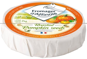 Cremiger Weichkäse mit gerösteten Kürbiskernen mit einer dünnen, orangefarbenen Rinde. Eine originelle Version des bekannten Fromager d’Affinois.