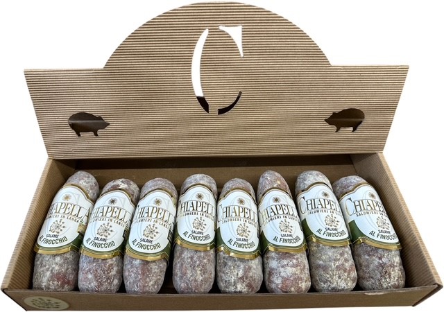 Betörender Fenchel-Duft, in dem Anklänge von Süßholz und Anis. Milde Salami aus erstklassigem Schweinefleisch aus kontrollierter piemontesischer Zucht und Herstellung. Im Naturdarm luftgetrocknet und je nach Reifezeit von weichem Schmelz oder knackigem Biss.