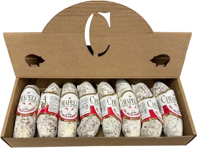Diese Salami wird ausschließlich aus Fleisch der Rinderrasse Piemontese hergestellt, die für ihr besonders mageres, zartes und aromatisches Fleisch geschätzt wird. Die Masse besteht zu 100 % aus Rindfleisch, ohne Beimischung anderer Fleischsorten. Nach traditioneller Verarbeitung wird sie von Hand in Rindernaturdarm gefüllt und schonend gereift. Das Ergebnis ist eine dunkle, sehr magere Salami mit einem klaren, charakteristischen Geschmack, der in seiner Art an hochwertige Bresaola erinnert.