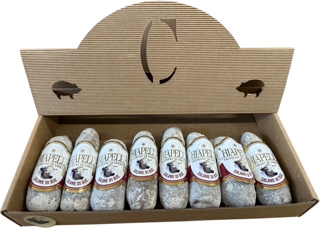 Die Salame di Bue ist eine charakteristische Spezialität aus Carrù, bekannt für seine Rindertradition und die berühmte „Fiera del Bue Grasso“. Für diese piemontesische Salami wird erstklassiges, sorgfältig pariertes Ochsenschulterfleisch verwendet, ergänzt durch Schweinefett und eine präzise abgestimmte Gewürzmischung.Im Naturdarm abgefüllt und handwerklich gereift, präsentiert sich die Salami in kräftigem Rot, mit aromatischer Würze und einem klaren, intensiven Geschmack. Eine hochwertige Spezialität, die Tradition und regionales Handwerk ideal verbindet.